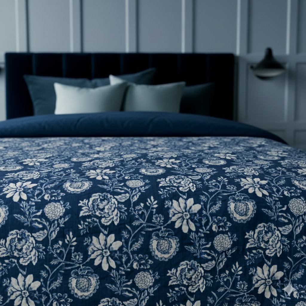Le couvre-lit Udaipur est notre plaid matelassé réversible avec deux imprimés différents.