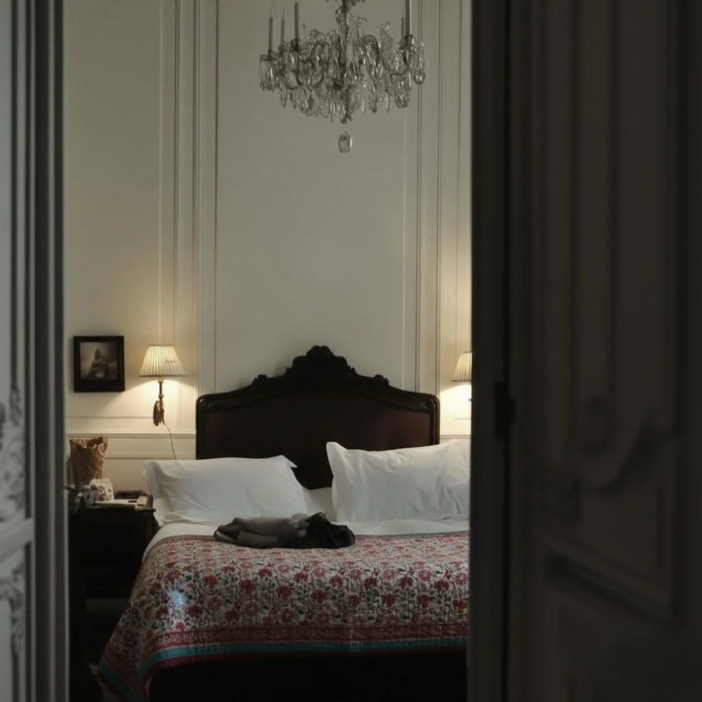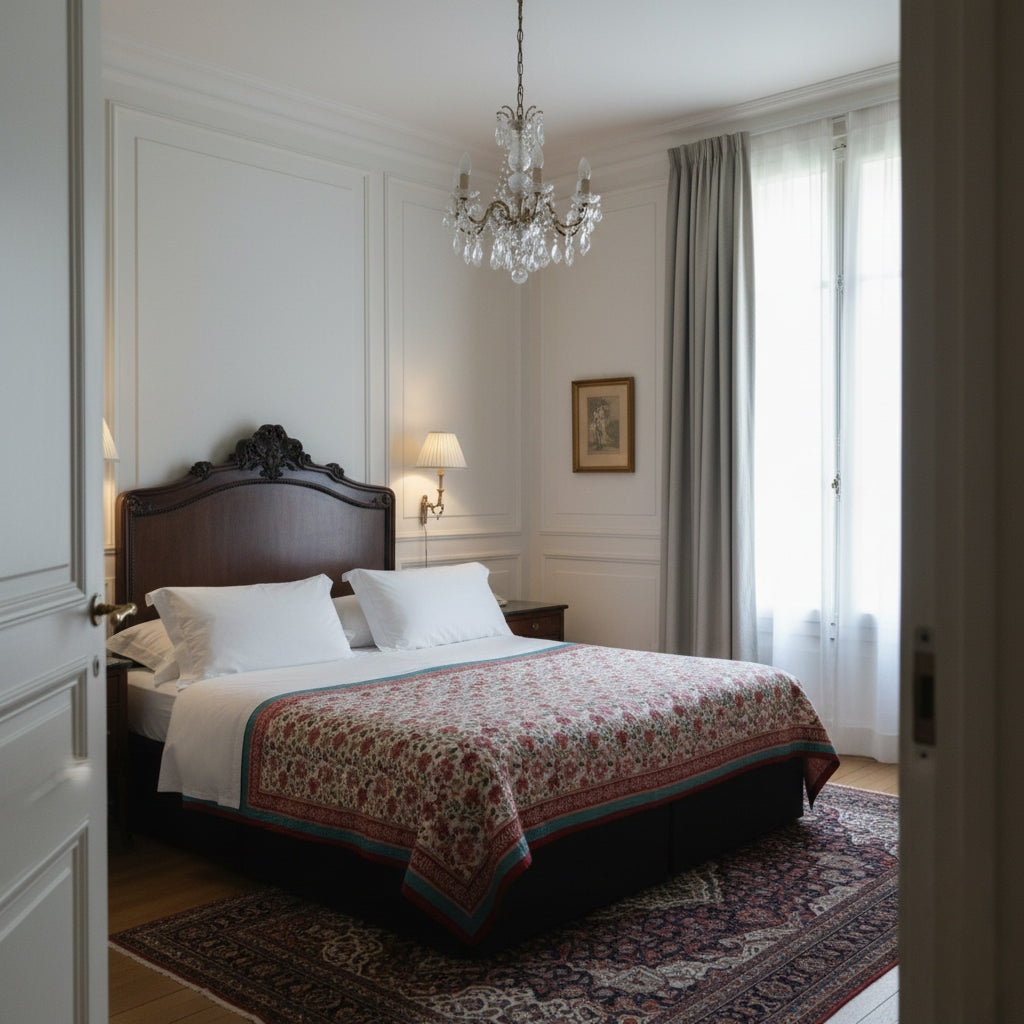 Le couvre-lit Udaipur est notre plaid matelassé réversible avec deux imprimés différents.