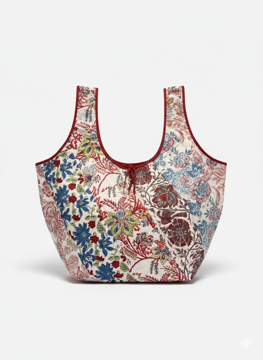 Le Sac Surat incarne l’âme de Maison Jaipur : un équilibre subtil entre tradition indienne et élégance contemporaine. Réalisé à partir de tissus imprimés selon la technique artisanale du block print, chaque sac est assemblé en patchwork, créant une pièce unique aux motifs floraux et géométriques.